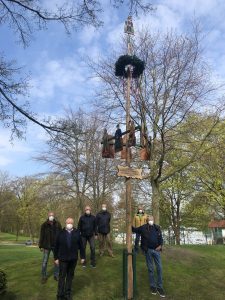 Auch wenn die traditionelle Maifeier des Bürgervereins Ellerau vor dem Bürgerhaus pandemiebedingt nicht stattfinden konnte, so hat er BVE dennoch zumindest den Maibaum aufgestellt. Ohne Tusch und Ansprache haben sechs starke Männer mit Abstand und Maske den Maibaum in seiner Halterung verankert und ihn wie gewohnt mit dem Kommando „Maibaum hoch!“ aufgerichtet. Nun wird der Maibaum bis Anfang Juni dort stehen. Das Aufstellen des Maibaums ist in unterschiedlicher Form eine viele hundert Jahre alte Tradition, die vor allem in Teilen Skandinaviens und in Mittel- und Süddeutschland aber auch in Österreich weit verbreitet ist. Der BVE stellt in Anlehnung an diese Tradition seit einigen Jahrzehnten einen Maibaum auf.